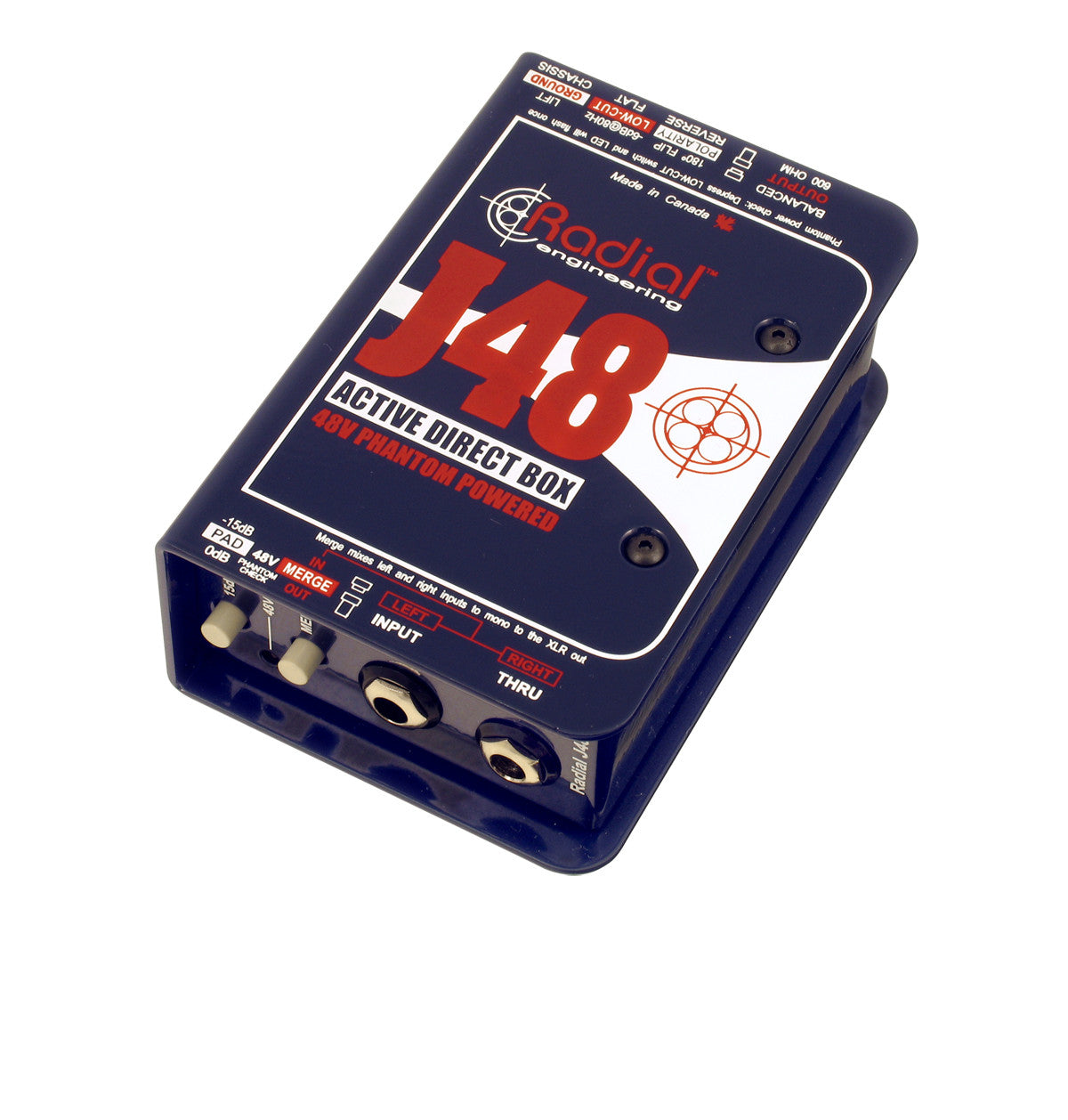 The Radial J48 is a great-sounding active direct box that has been optimized to produce maximum headroom while working within the limited current available from standard 48V phantom power. By employing a unique switching power supply, the J48 is capable of peak transients to 9 volts without choking. The result is lower harmonic distortion, half the intermodulation distortion and significantly improved dynamics over other DIs.